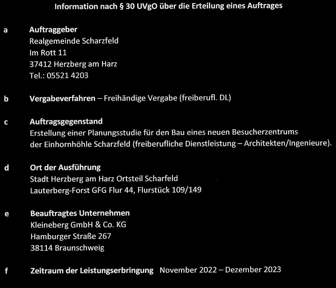 Die Realgemeinde Scharzfeld (K.d.ö.R.) läßt in enger Zusammenarbeit mit dem Forschungsverein GUf e.V. eine Studie erarbeiten, um das bisherige Funktionsgebäude „Haus Einhorn“ an der Einhornhöhle durch einen Um- und Erweiterungsbau zu einem modernen Besucherzentrum zu erweitern.
